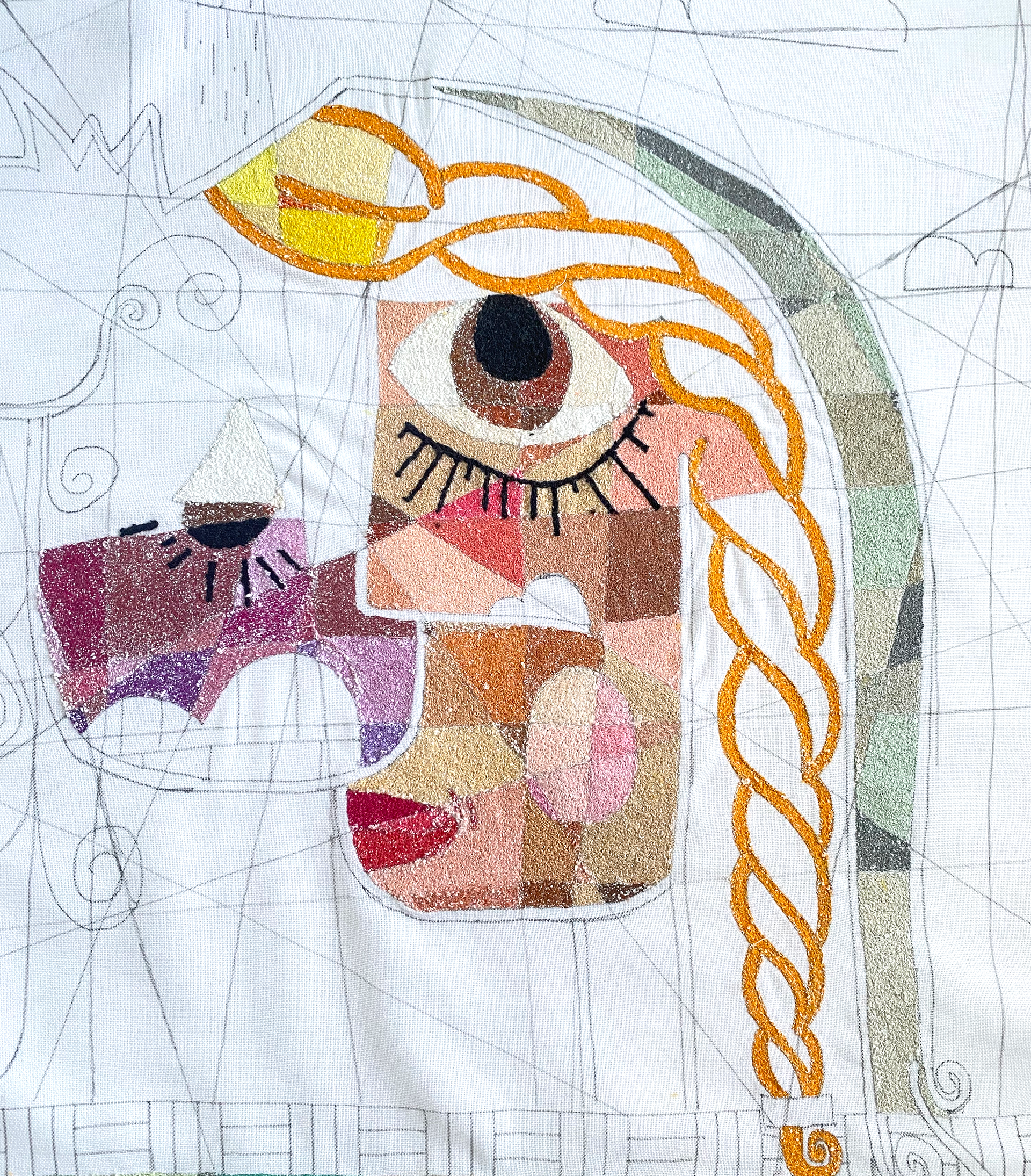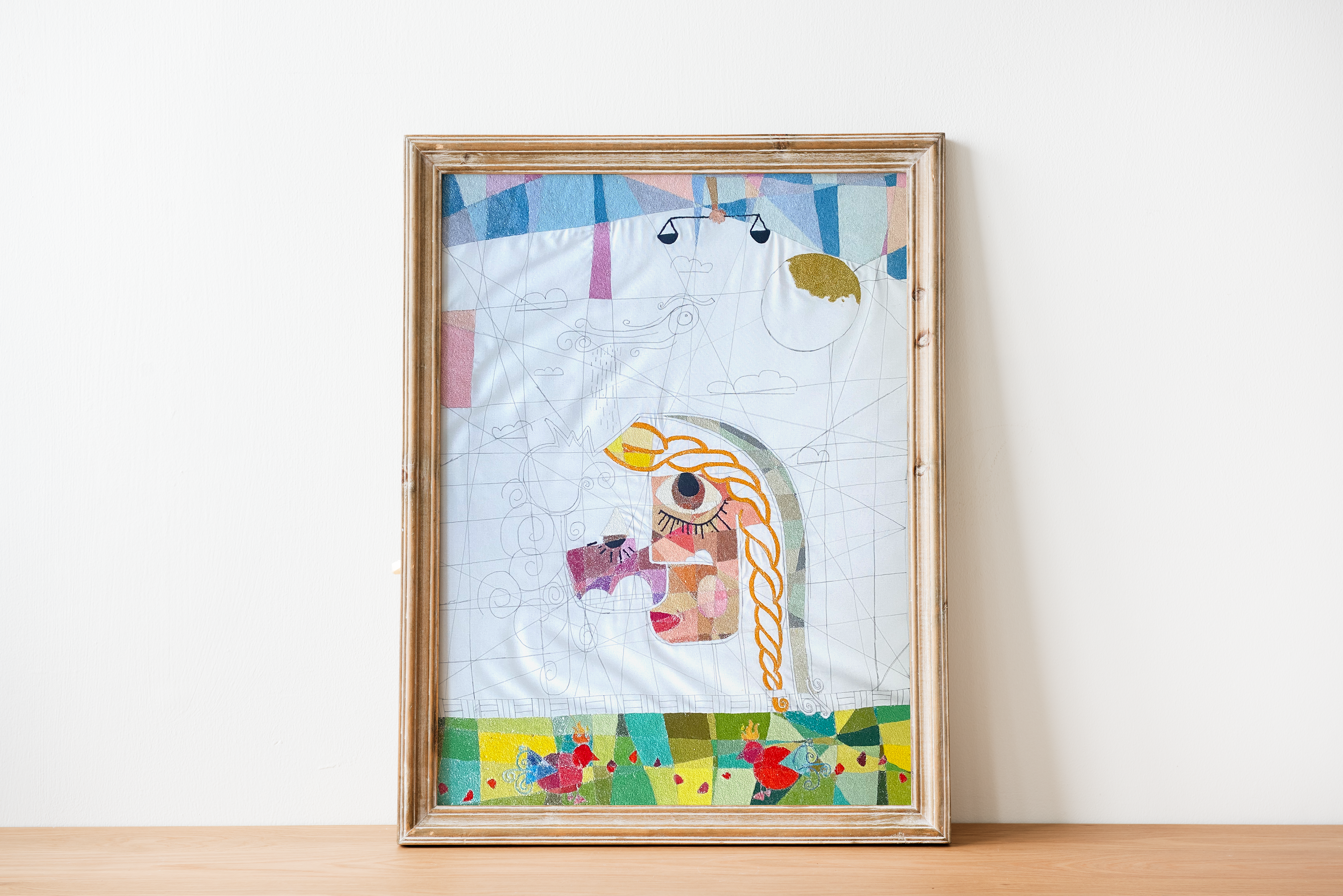 The embroidery process, guided by the artist’s hand yet mediated through the mechanical rhythm of the sewing machine, becomes a metaphor for negotiation between control and surrender, consciousness and instinct. The stitched surface, both fragile and assertive, mirrors the psychological terrain of Persephone: oscillating between descent and return, silence and expression, darkness and bloom.